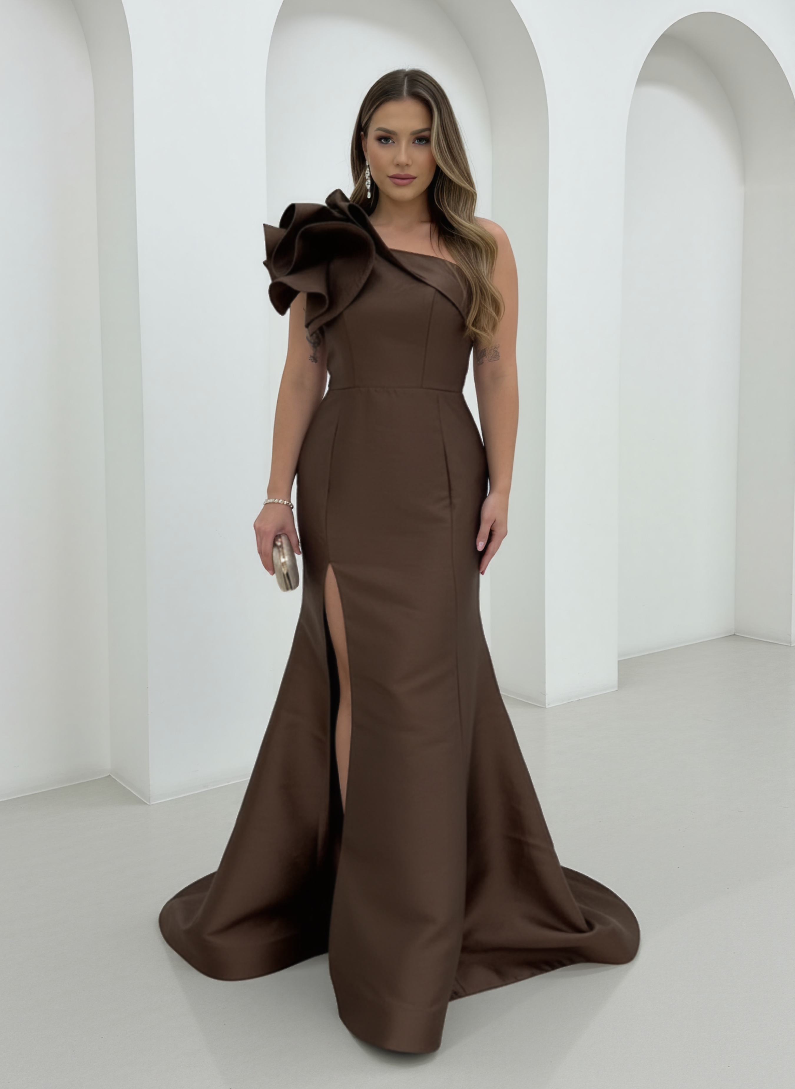 Este vestido Duda, em tecido zibeline na elegante cor marrom/mocha mousse, destaca-se pela fenda que proporciona movimento e sofisticação. O... Ler mais