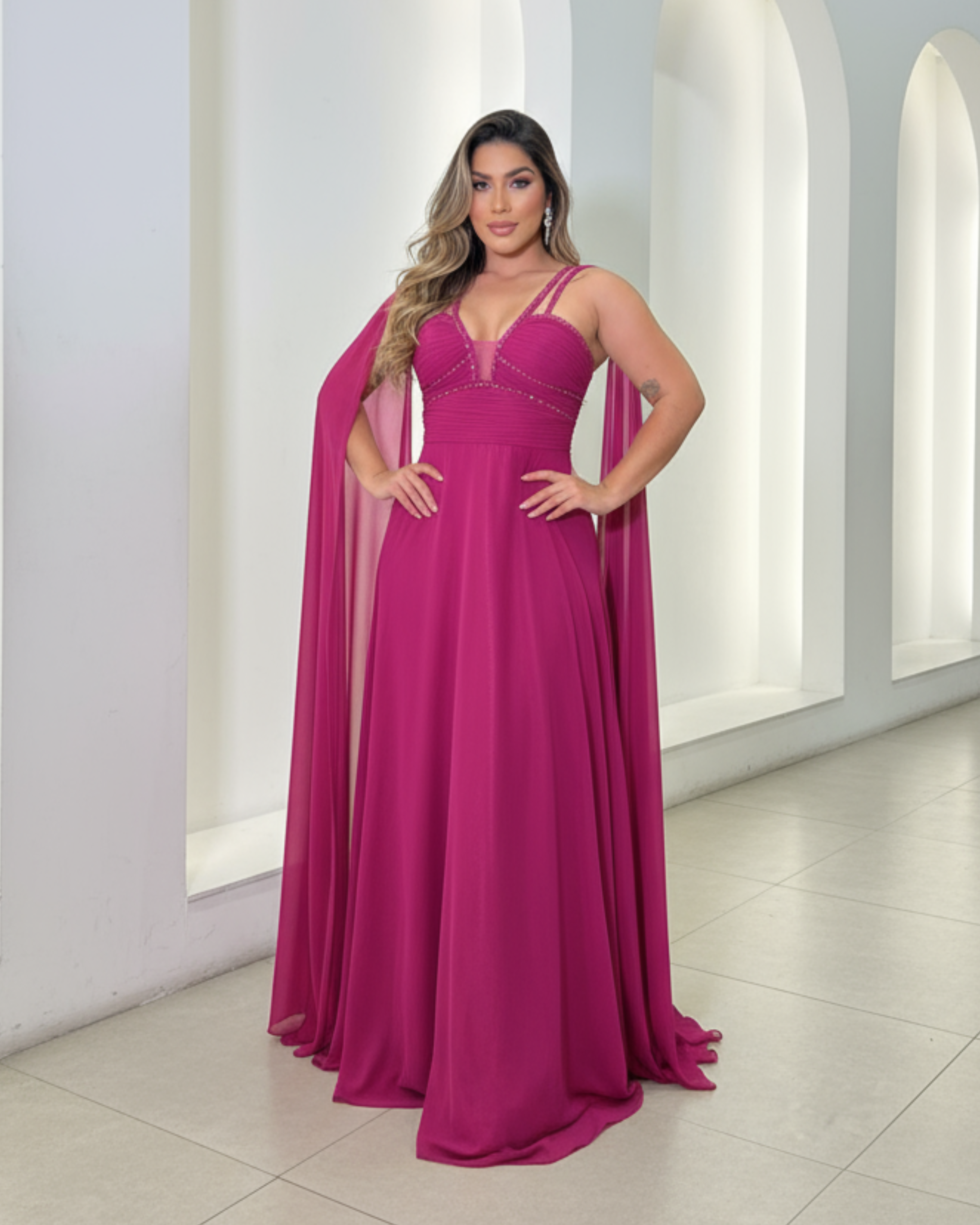O vestido Laura em tom pink destaca-se pelas mangas fluidas que conferem leveza e movimento, enquanto as alças finas bordadas... Ler mais